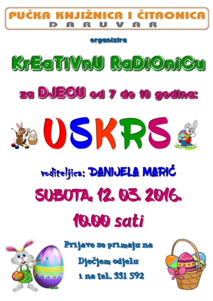 pozivamo vas da se prijavite na kreativnu radionicu za djecu od 7 do 10 godina, koja će se održati u subotu 12.3.2016. u 10.00 sati. Prijave su u tijeku!